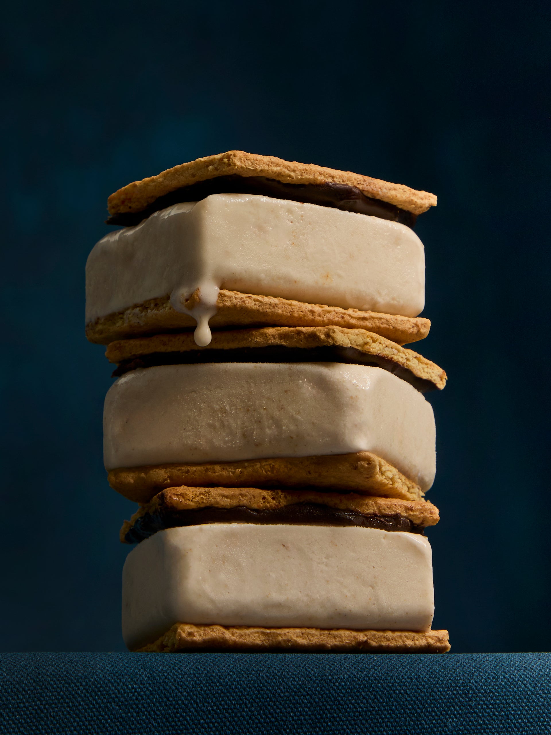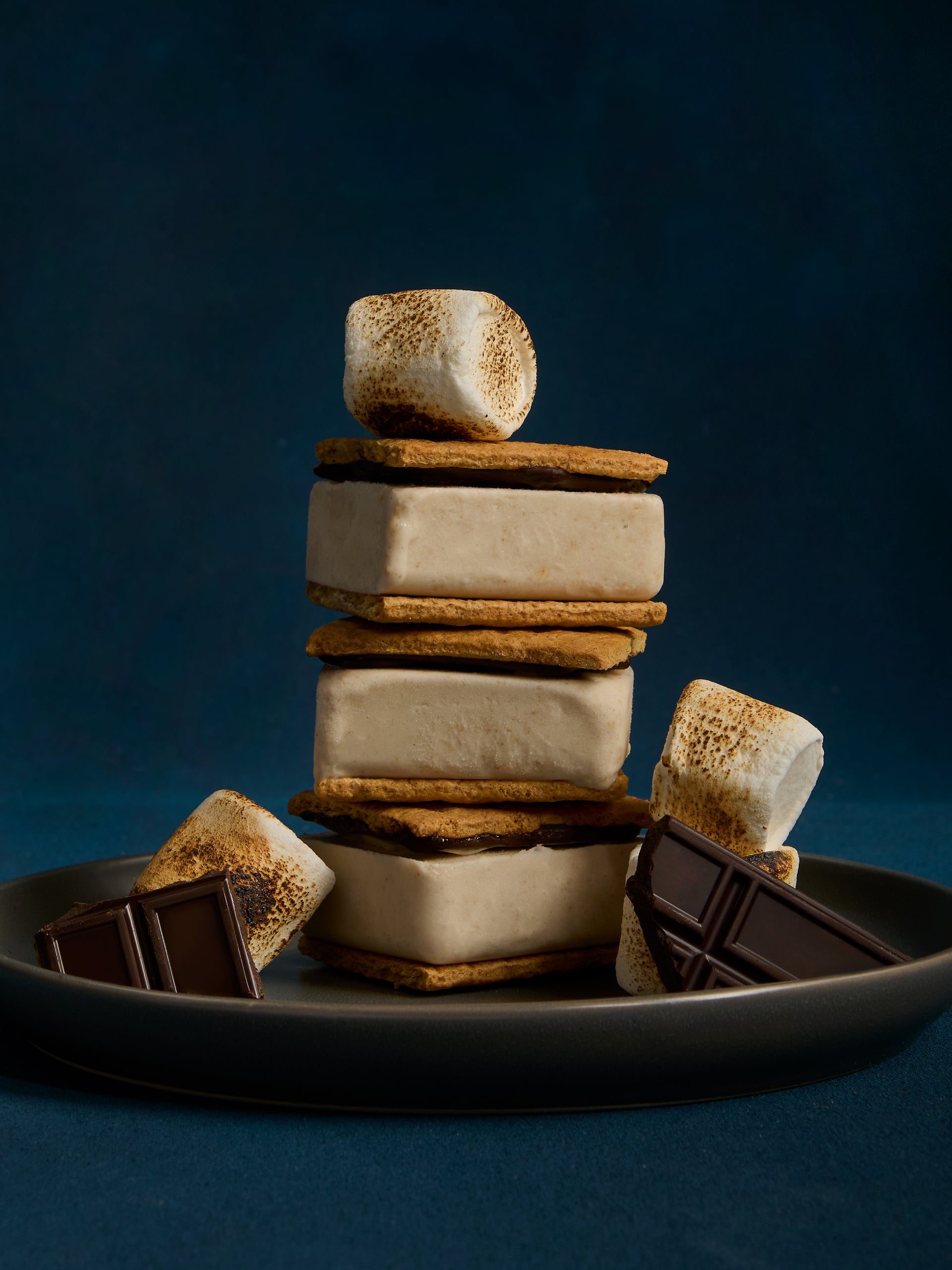 Vanilla ice cream infused with Graham Cracker Crumbs and Toasted Marshmallows, sandwiched between a layer of melted Dark Chocolate and two Graham Crackers