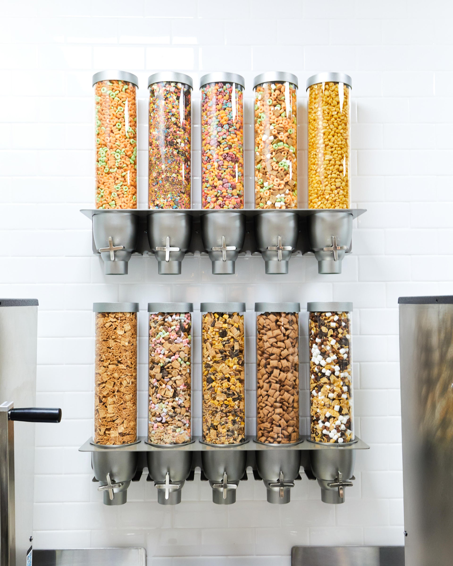 Visitors can enter through Kith Kid’s main entrance via the Empire Stores or directly from within the market, where patrons are immediately greeted by Kith Treats’ signature illuminated header. The 508 square foot space harmonizes with both the neighborhood's vibrant atmosphere and the store's design language with a tasteful blend of wood, stone, and stainless steel accents. Highlighted by Kith Treats’ signature parlor-style cereal dispensers and Rosa Aurora marble countertops, the space also features a twelve-seat dining area comprised of six vibrant turquoise banquettes, allowing guests to enjoy their confections in-store. Visitors can also opt for the standing bar, which offers a direct view down the corridor connecting Water Street to the waterfront. Around the corner from Treats is a wall of cubbies featuring Kith Kids offerings such as toys, books, and puzzles, adorned with custom Kith monogrammed wallpaper in playful tones of pink and blue.