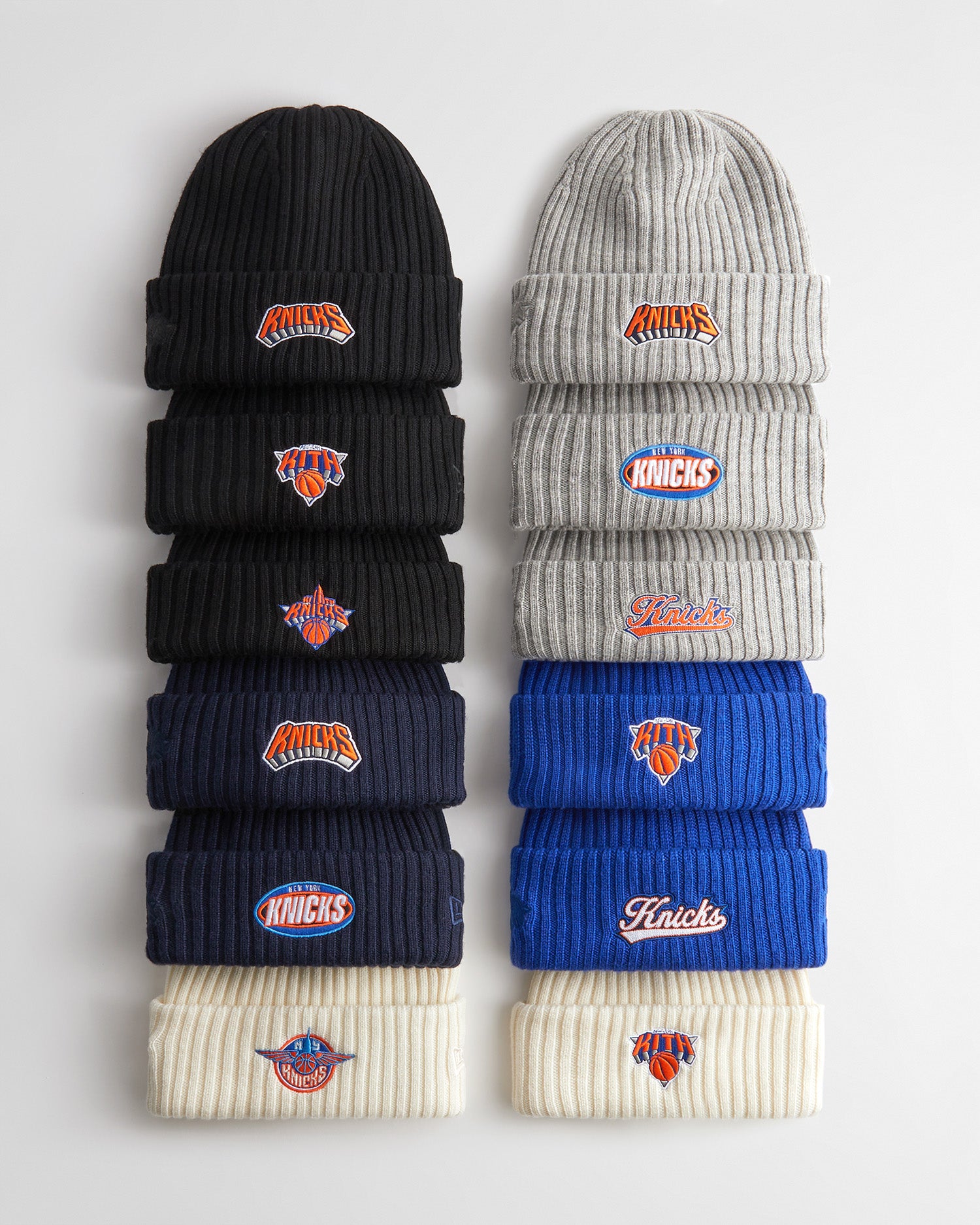 Shop accessories from Kith for the New York Knicks, featuring headwear designed in partnership with New Era, the seasonal Mia Beanie with co-branded artwork, and socks made from premium cotton.