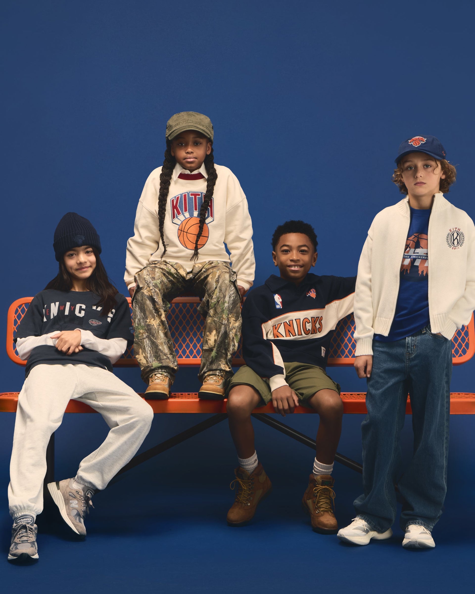 This season, Kith Kids and the New York Knicks present a collection of apparel and accessories featuring the official team colors of the 1982-83 season and the modern era of our hometown team. Featuring graphic tees and bodysuits adorned with co-branded artwork and New York to the World iconography, this collection also includes new iterations of the Nelson silhouette, offered in hoodie, crewneck, and pullover styles. Each piece is crafted from ultra-soft fabrications and finished with Kith for the New York Knicks motifs throughout.