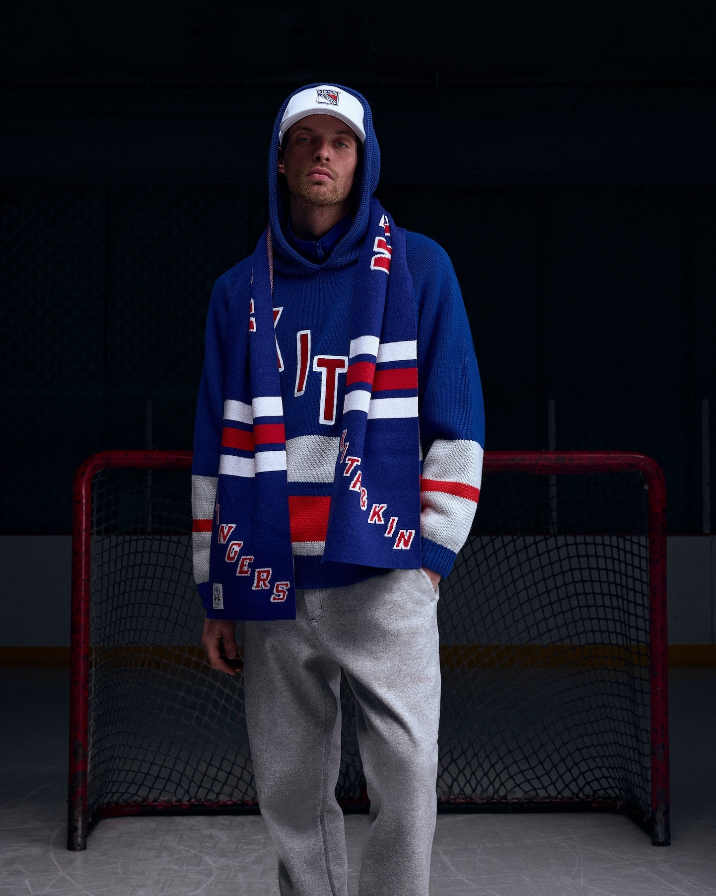 Explore the accessory assortment from Kith for the New York Rangers, featuring headwear silhouettes designed with ‘47 such as the Franchise LS and the Hitch Snapback, alongside co-branded crew socks, knitted scarves, and puck-shaped coasters.