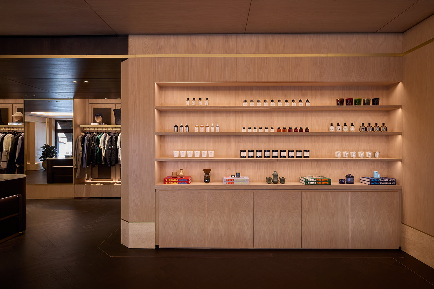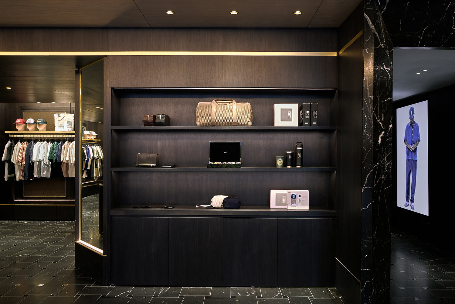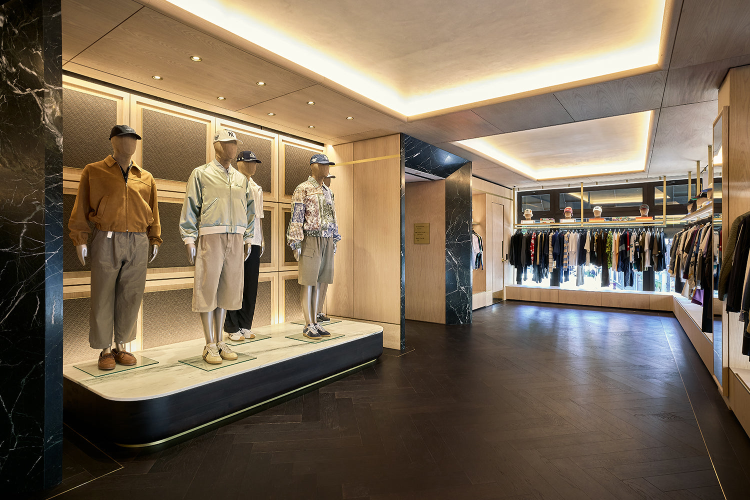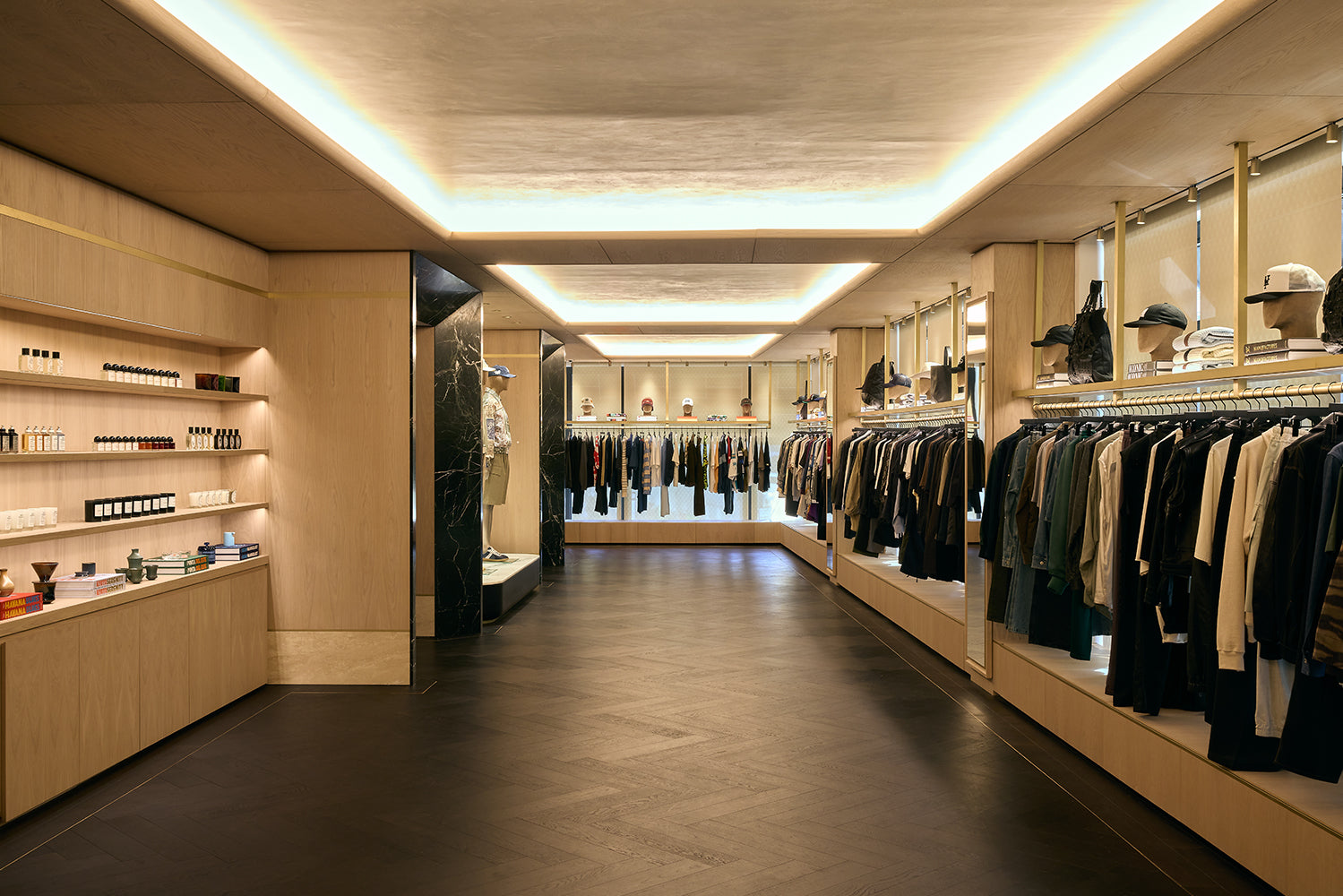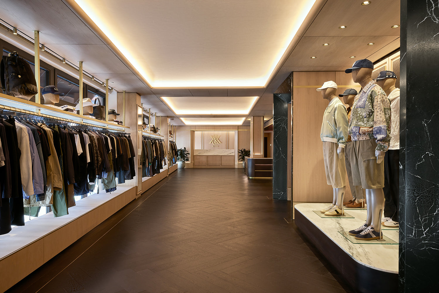 Located at 337 Lafayette Street in the heart of Manhattan, the Kith Manhattan flagship store first opened its doors in 2017. After nearly a decade, the three-story building, originally constructed in 1922, was renovated to reflect the current ethos of Kith, highlighted by the men’s line, vast assortment of additional designer apparel, accessories, and footwear, and a Kith Treats Window. The space utilizes a blend of dark walnut, white ash wood, luxurious marble, and herringbone wood floors.